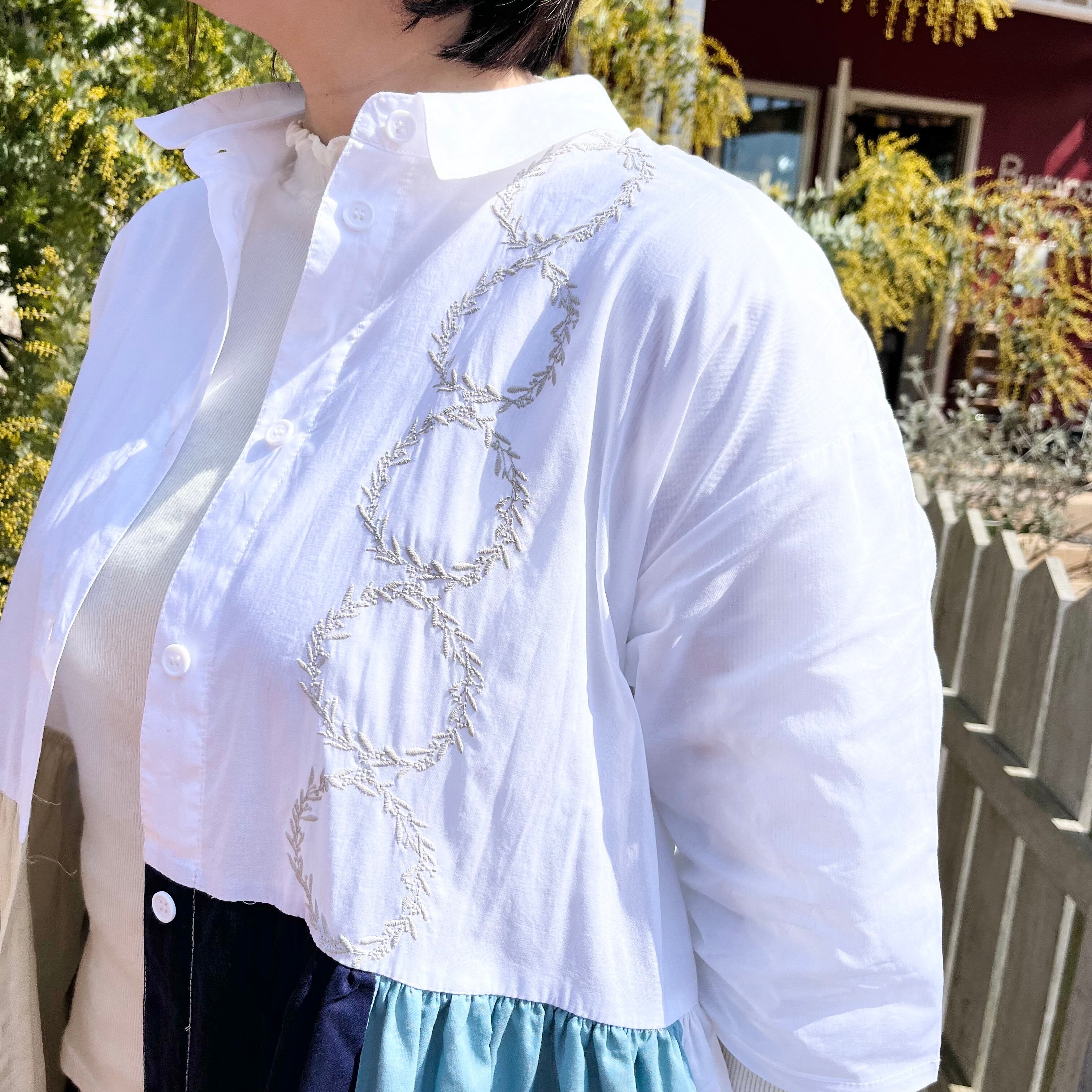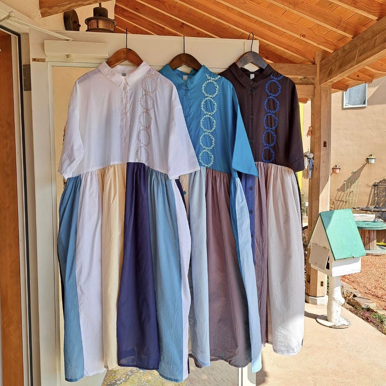 カジュアルにもフォーマルにも対応可能な、リース刺繍切替えパッチワークワンピースです!