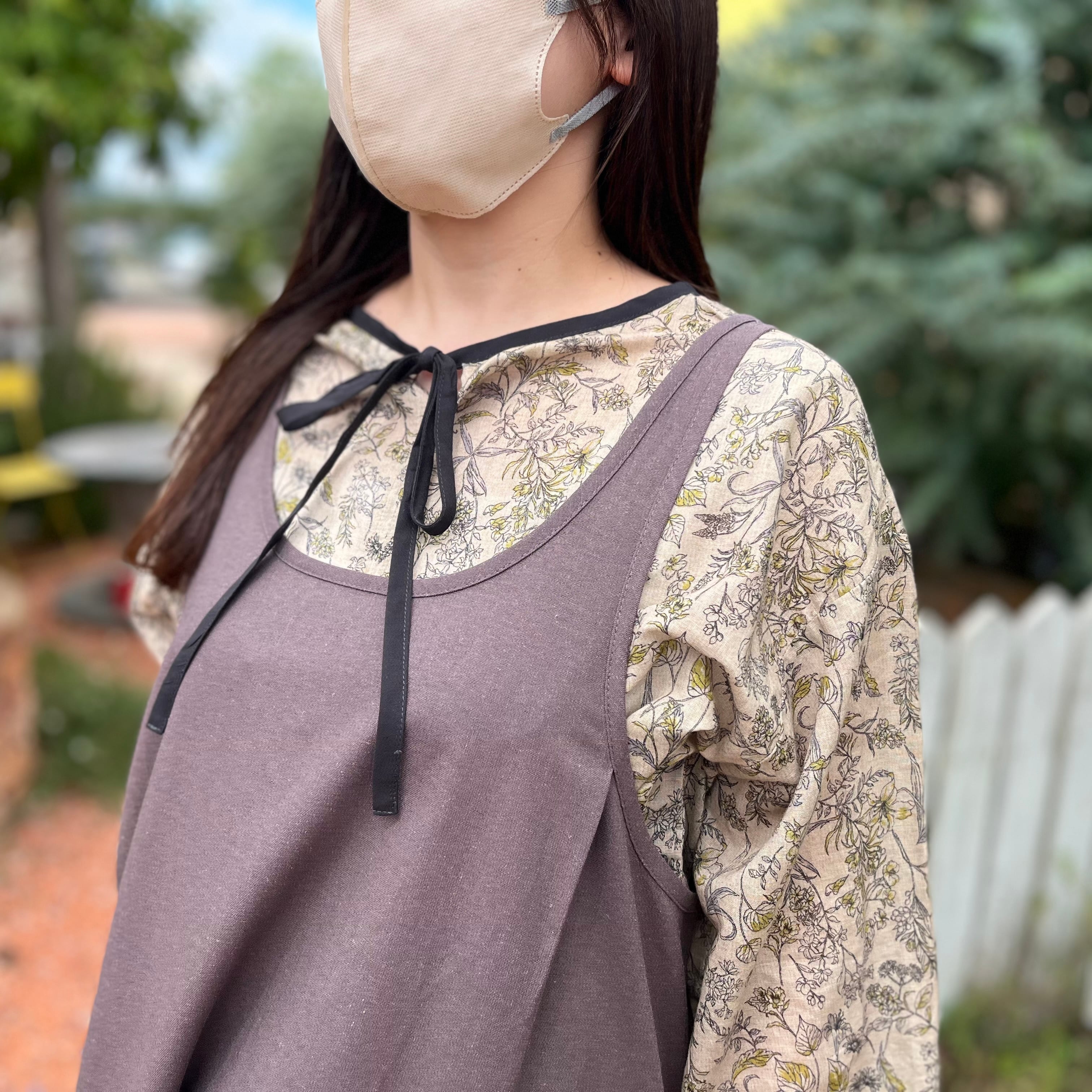 後ろのリボンの襟元が愛らしさを引き立て、コーディネートにフェミニンな印象を添えます。