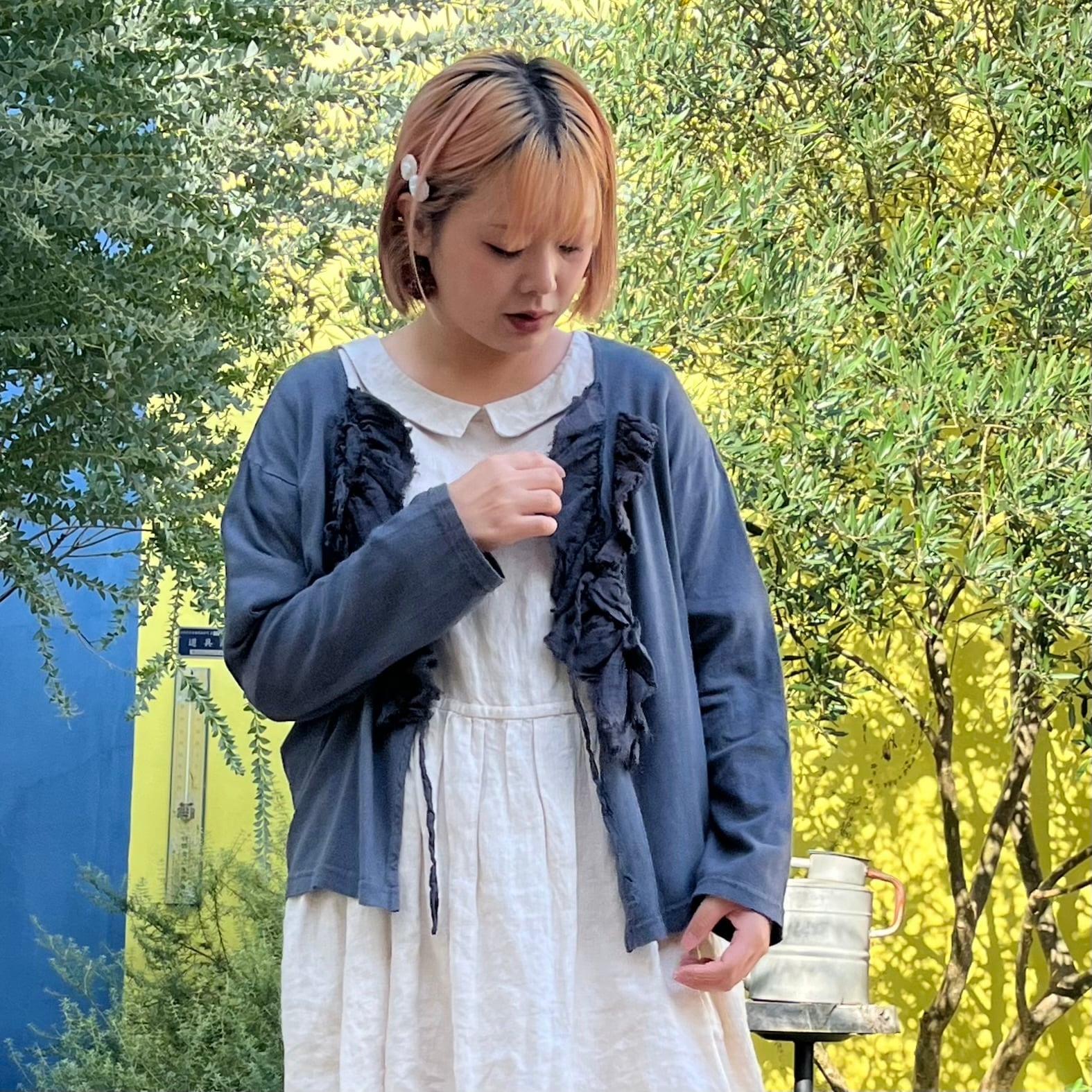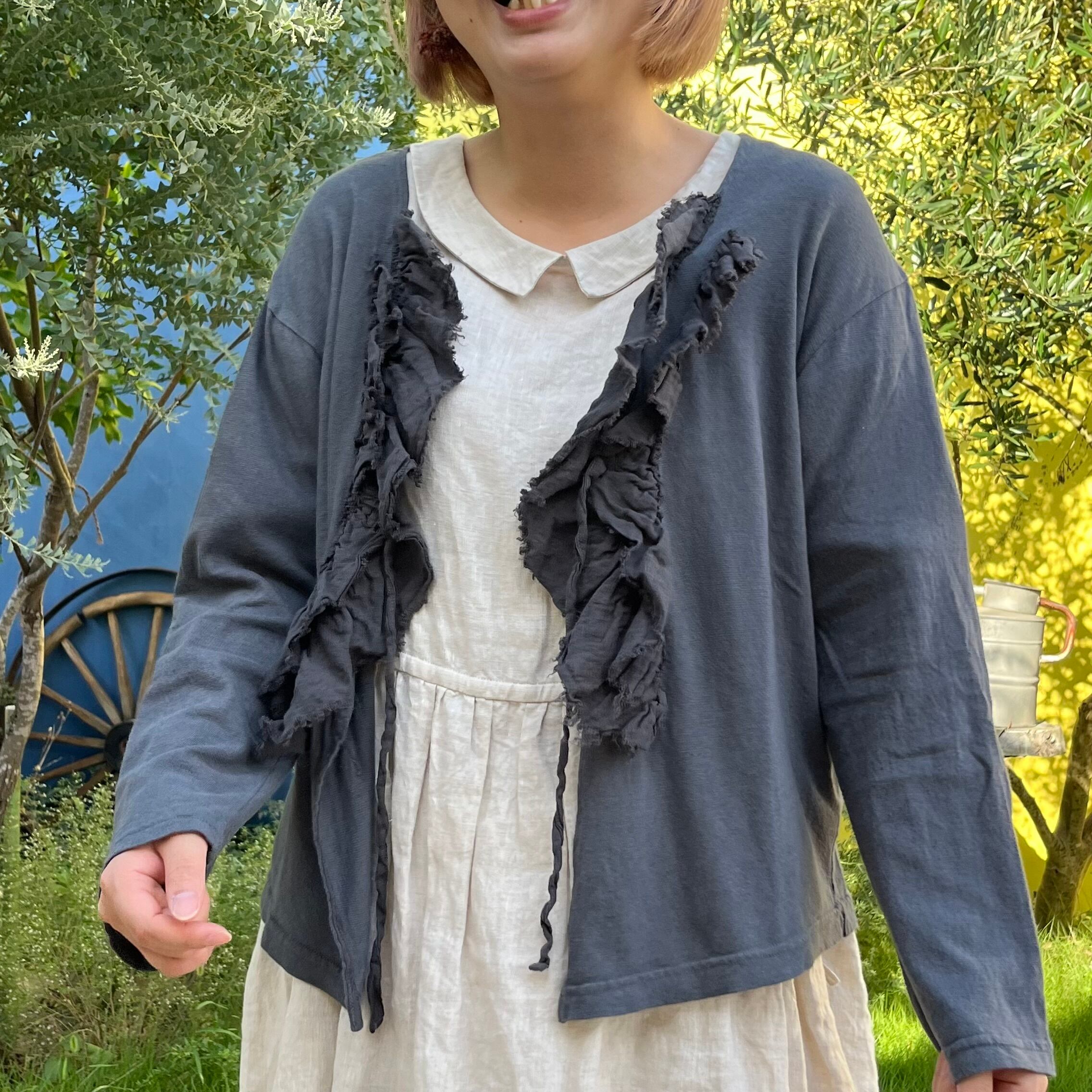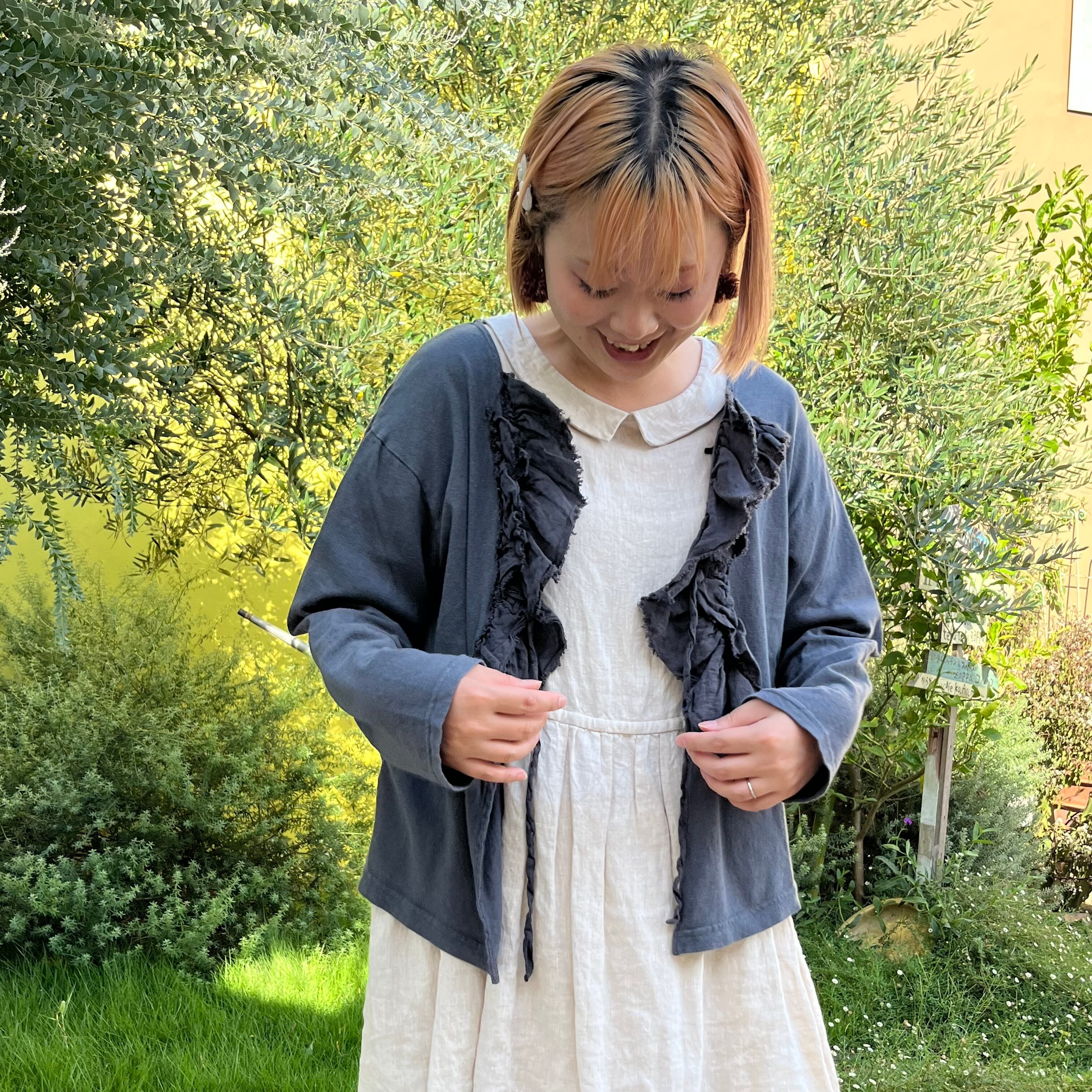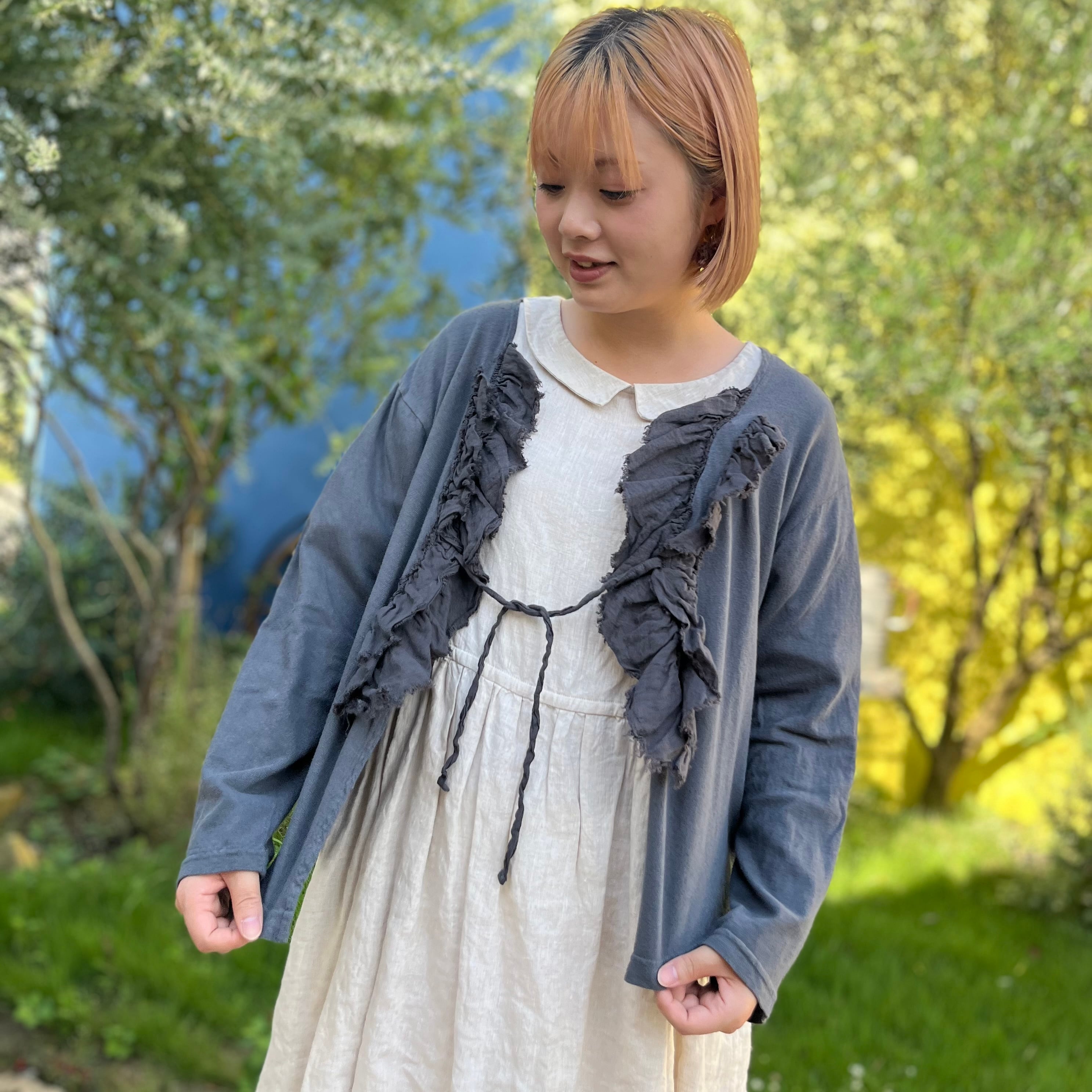 前立てのフリルがさりげない華やかさを添え、シンプルなコーデにプラスするだけで、大人なナチュラルスタイルが完成します。