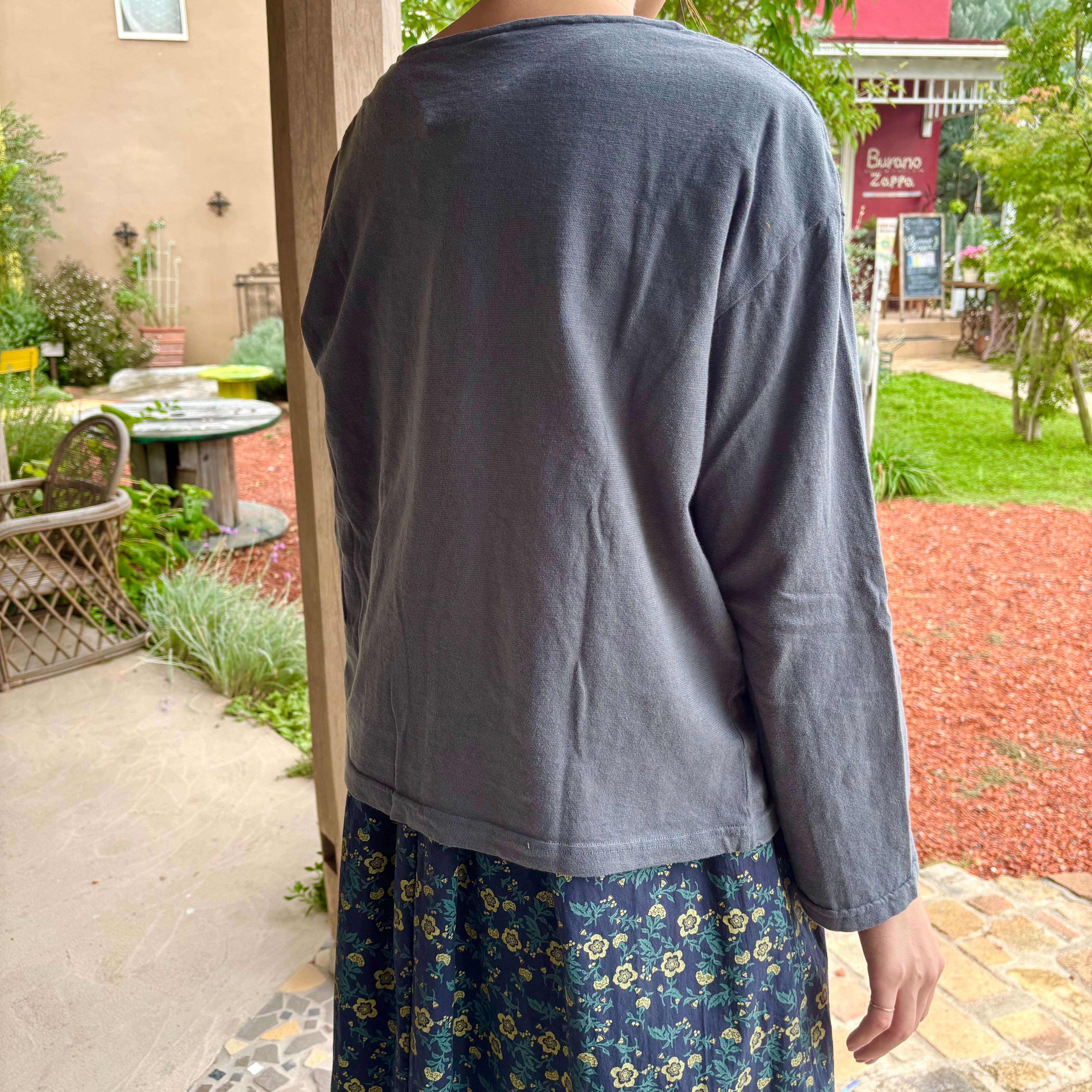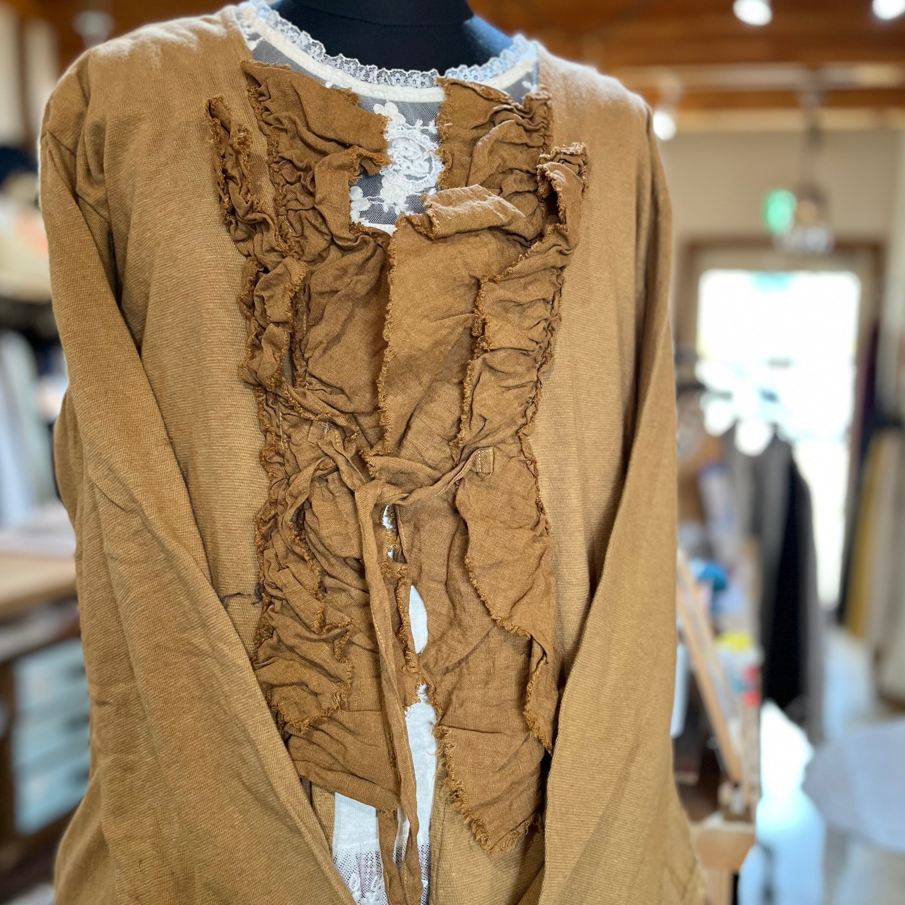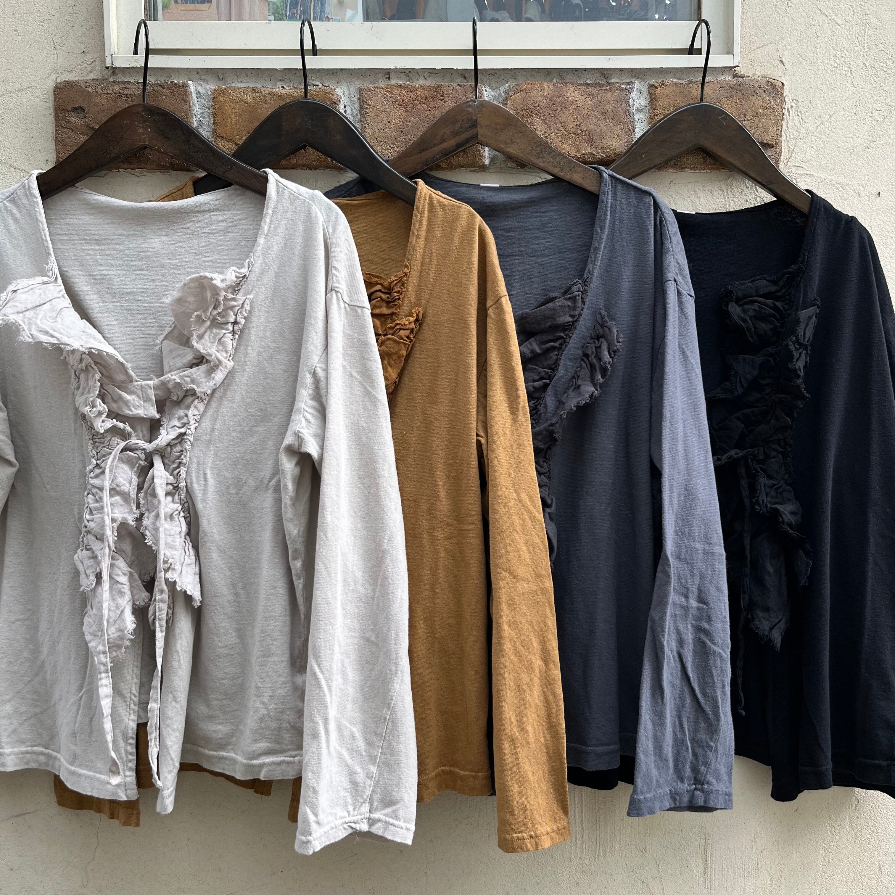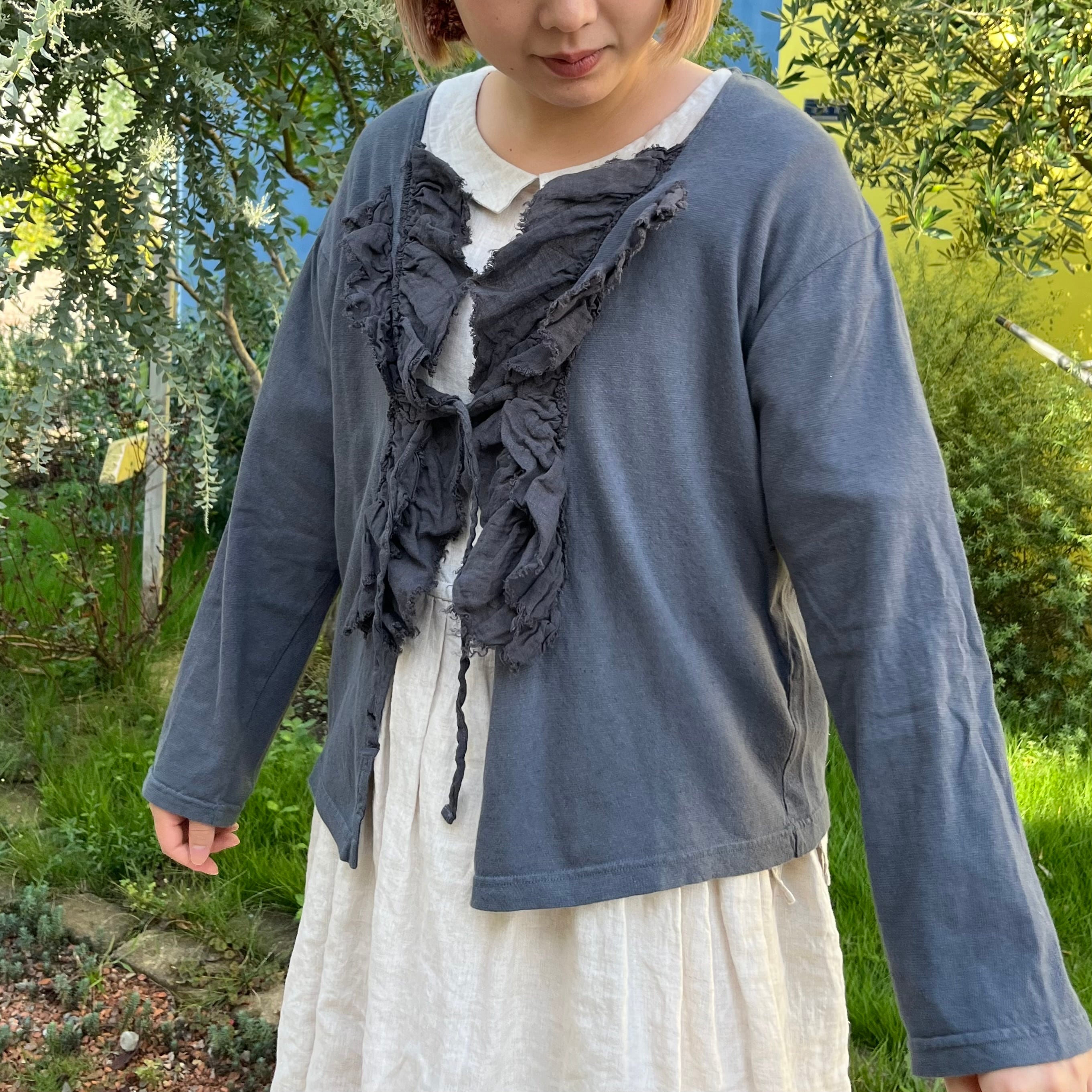 前立てのフリルがさりげない華やかさを添え、シンプルなコーデにプラスするだけで、大人なナチュラルスタイルが完成します。