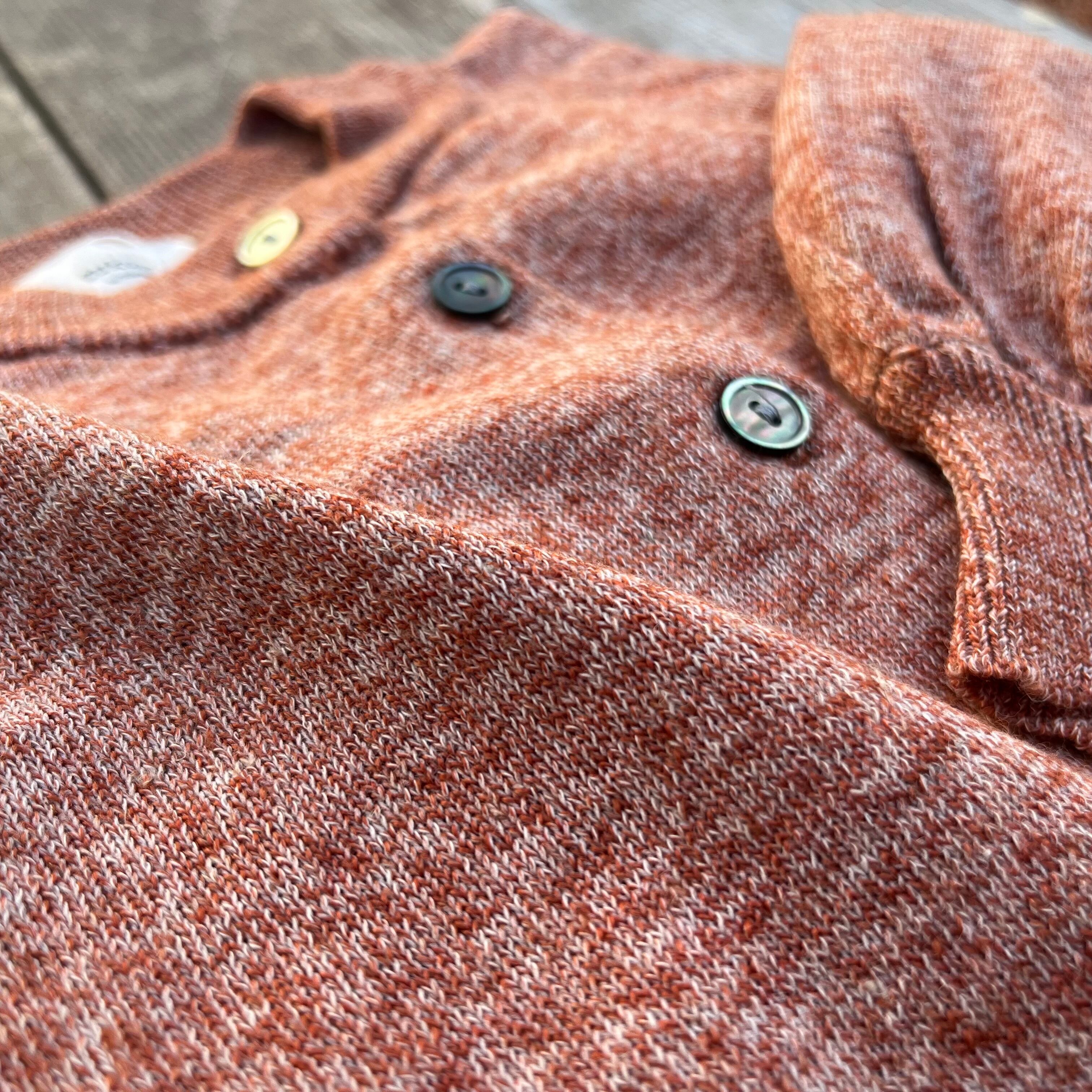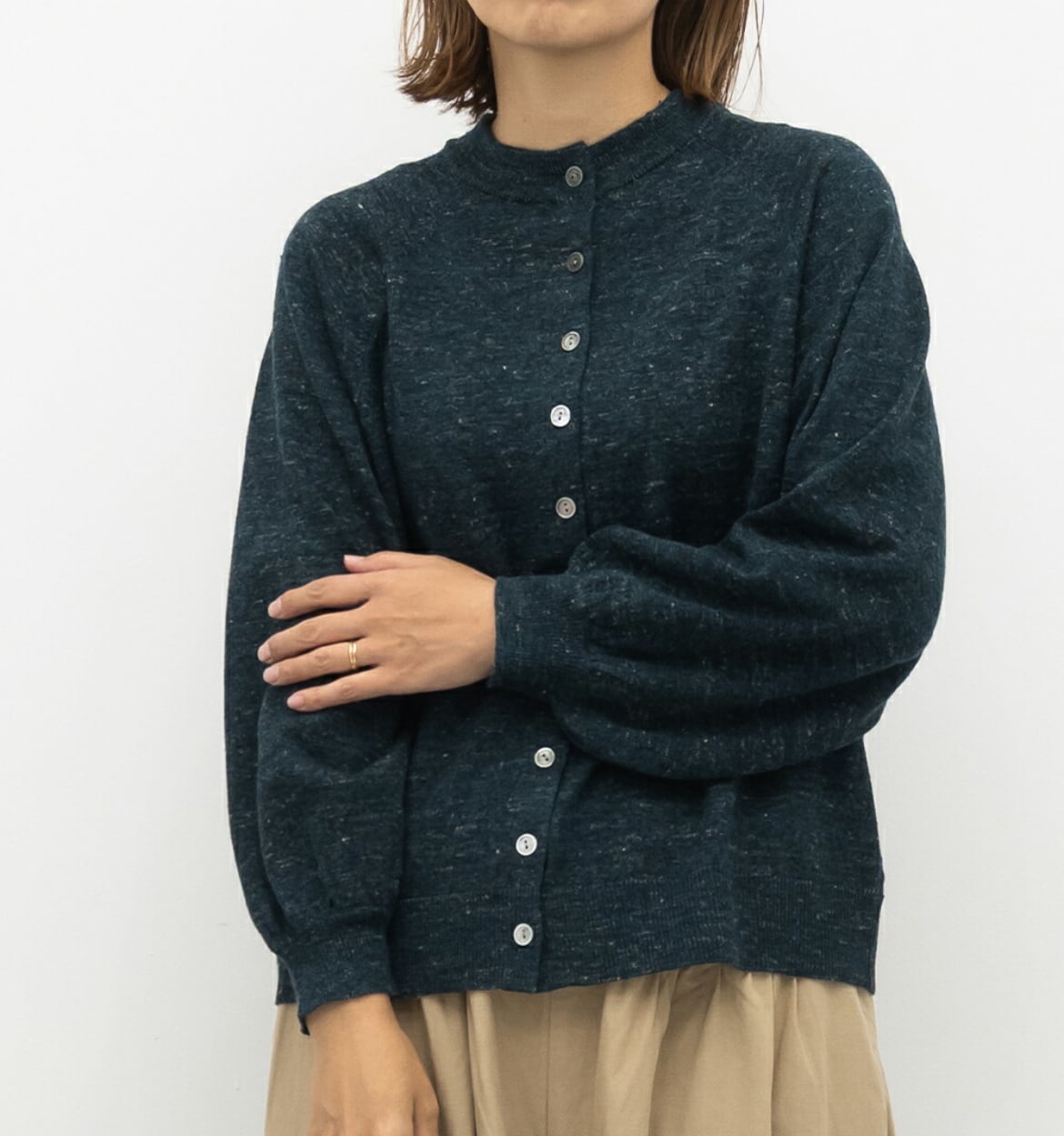 ミックス調のカラーがアクセントのリネンとウールをブレンドしたハイゲージニットのカーディガンです。