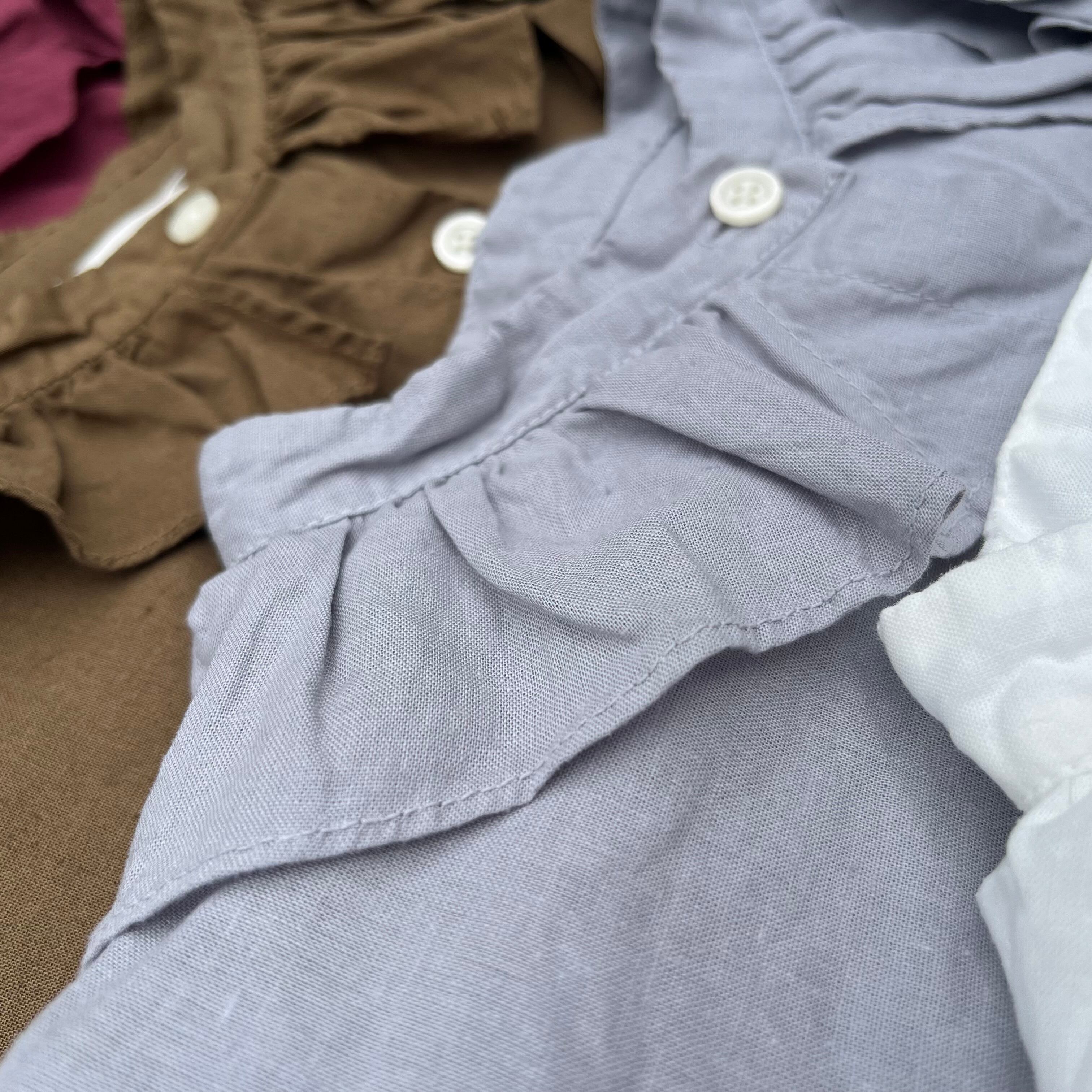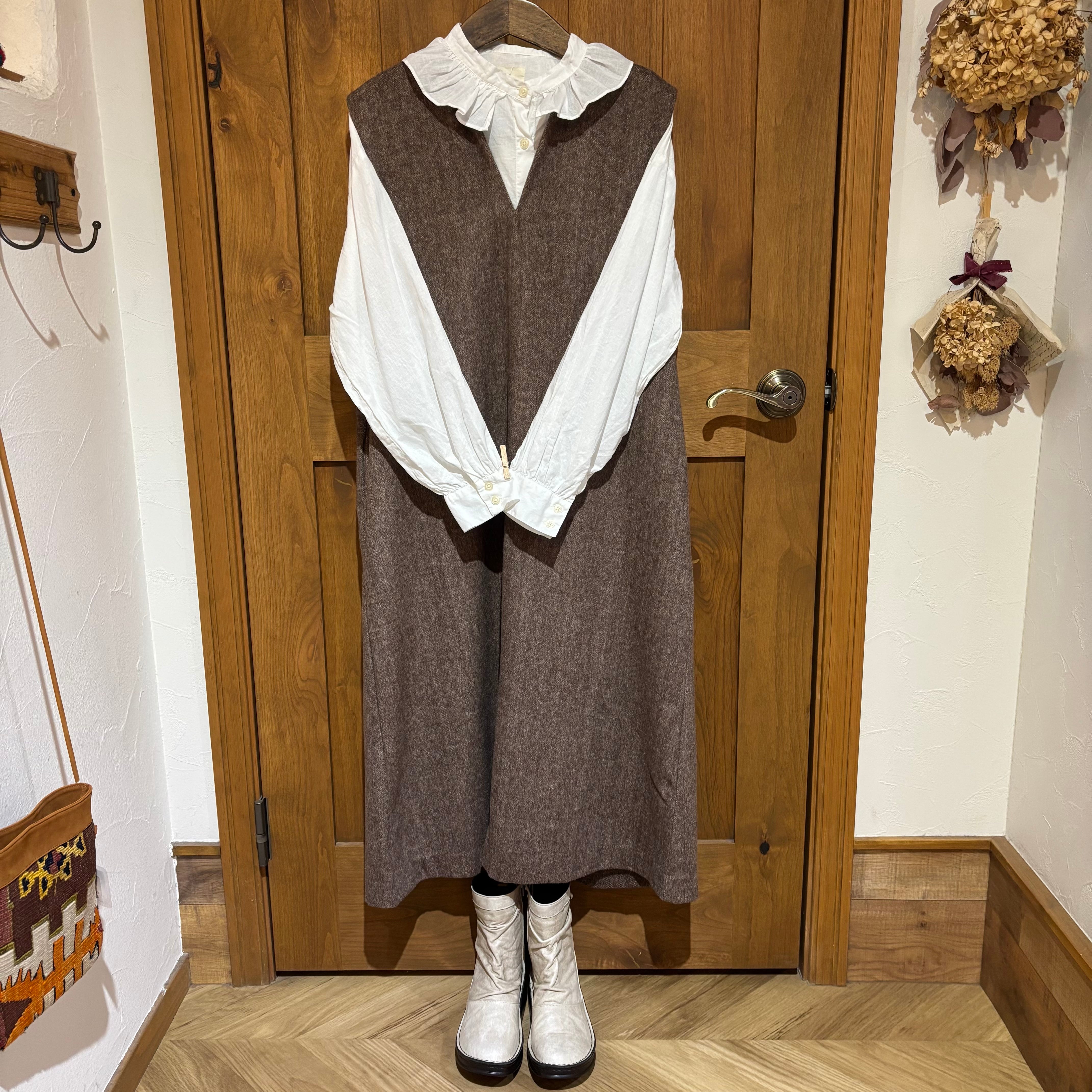 襟元のフリルデザインが女性らしいアクセントとなり、さりげなく華やかさをプラス。